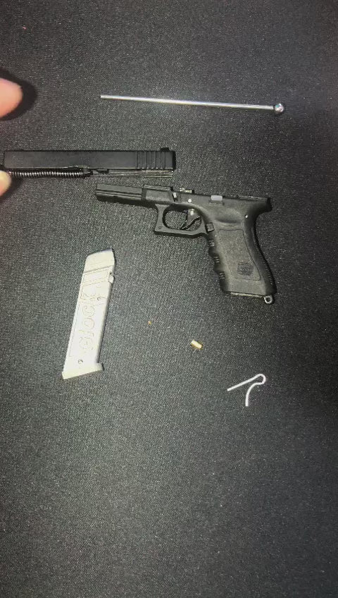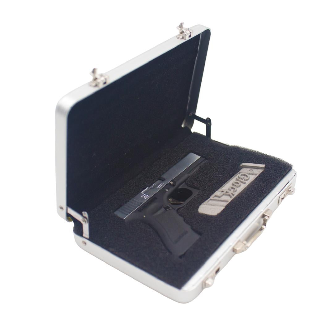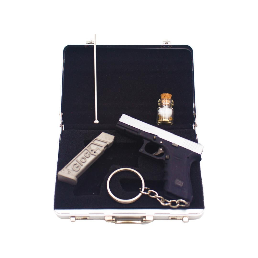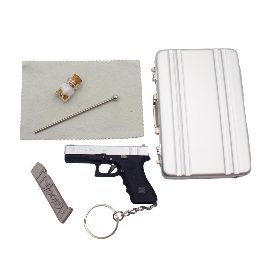Mini pinfire Glock comes with case and accessories. You will need to add gun powder to the cap. Comes with 2mm BB projectiles. Allow 2-3weeks for customization and shipping. In stock while supplies last.
